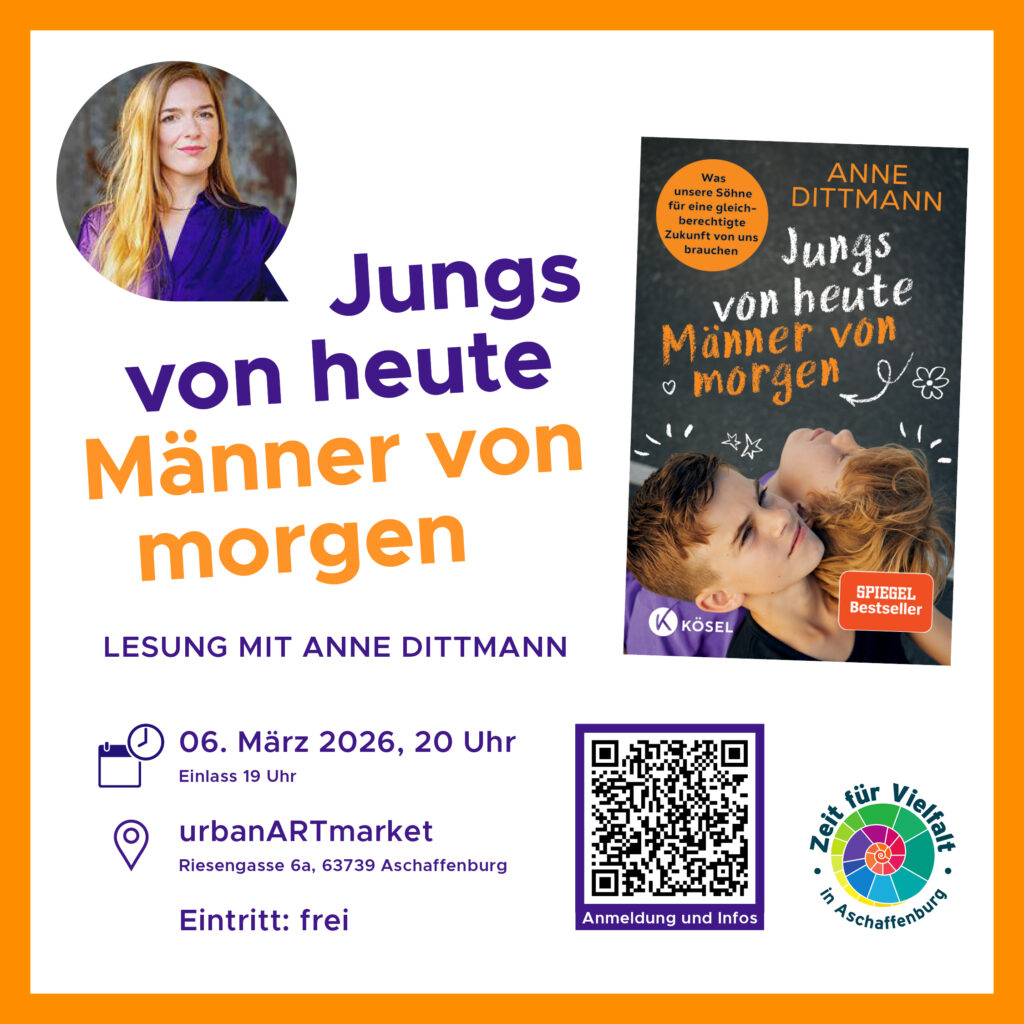 Lesung mit Anne DittmannWann: 06.03.2026 — 20:00 Uhr Beginn — 19:00 Uhr EinlassWo: Urban Art Market, Riesengasse 6a, 63739 AschaffenburgVeranstalter*in: AK Zeit für VielfaltKosten: Eintritt…